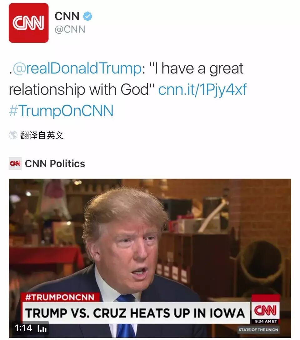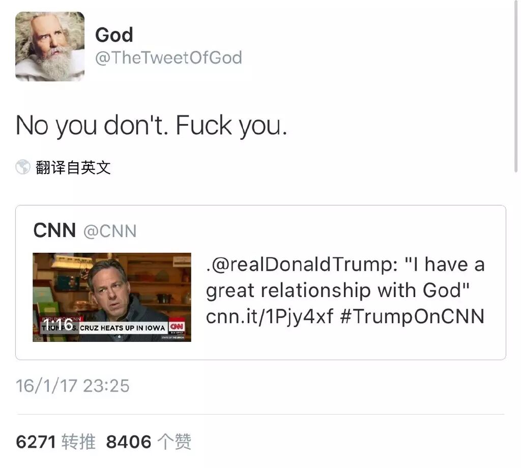 又有一回,川普自夸和上帝关系好,一转身「上帝」就出来打脸了,如此直白就不用翻译了吧: