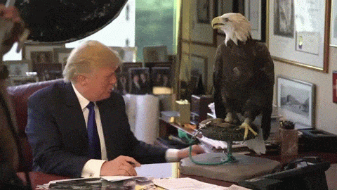作为看热闹不嫌事儿大的网民们,最喜欢的就是看他出丑。比如有一回川普为时代杂志拍封面,用一只白头鹰做道具,结果被鹰攻击吓到脸歪,这一幕被喜闻乐见地做成了动图:
