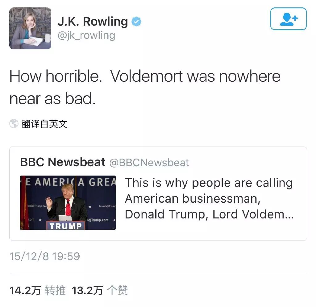 作为一个高调的大嘴巴,川普喜欢和明星名人对喷,又被各种实力打脸。有一回,网友们表示川普是伏地魔,随后HP作者JK罗琳发推:「伏地魔才没他那么坏呢」: