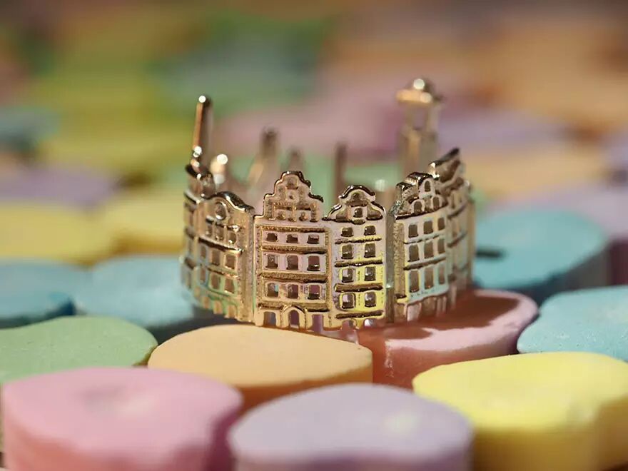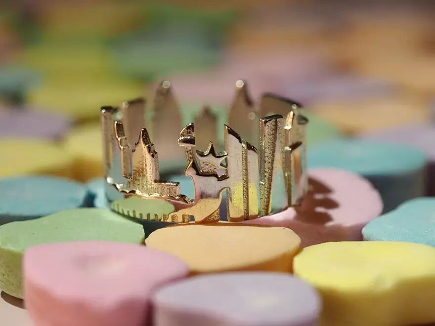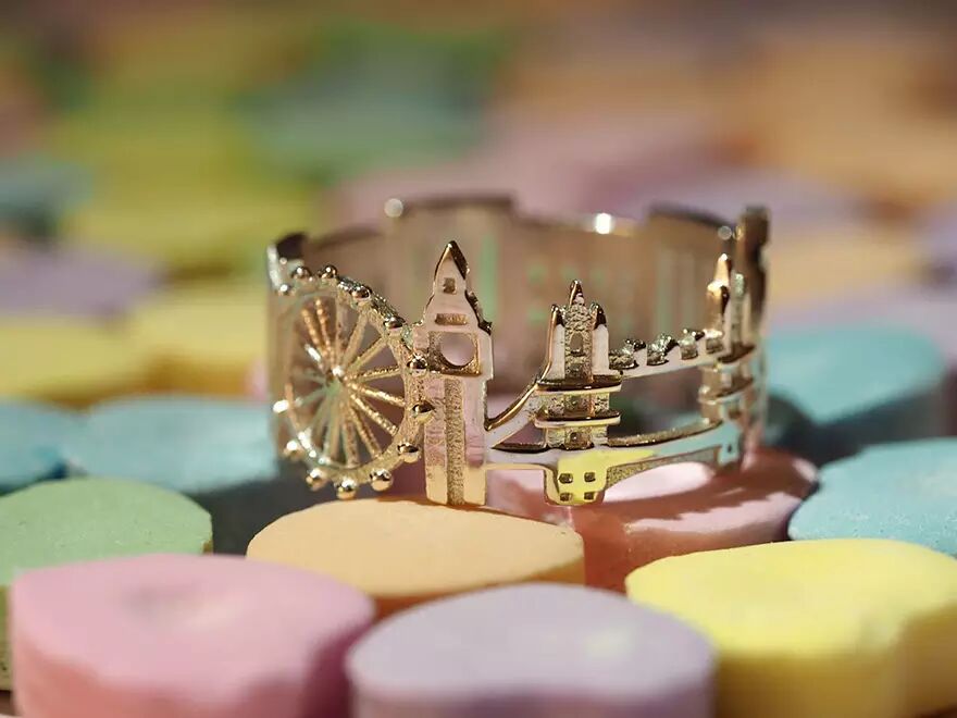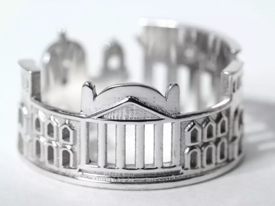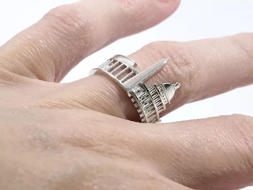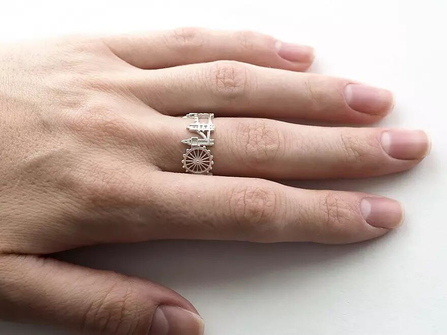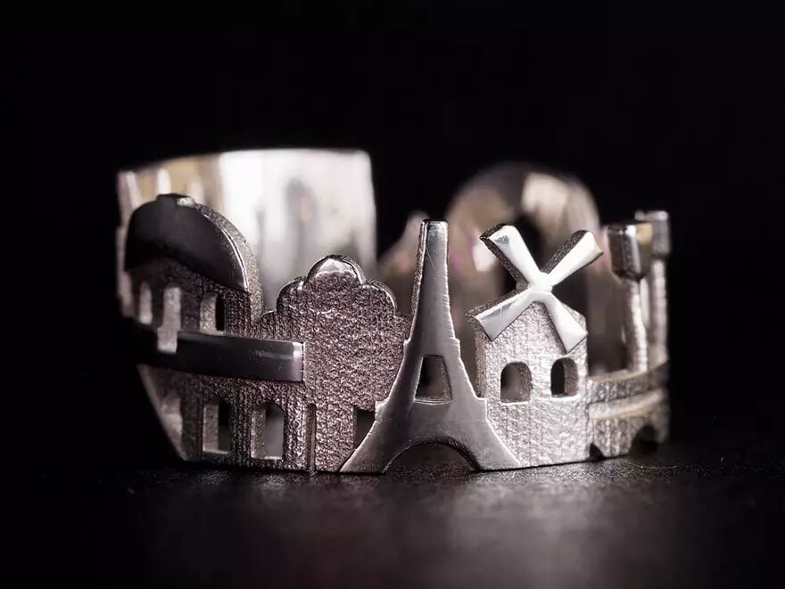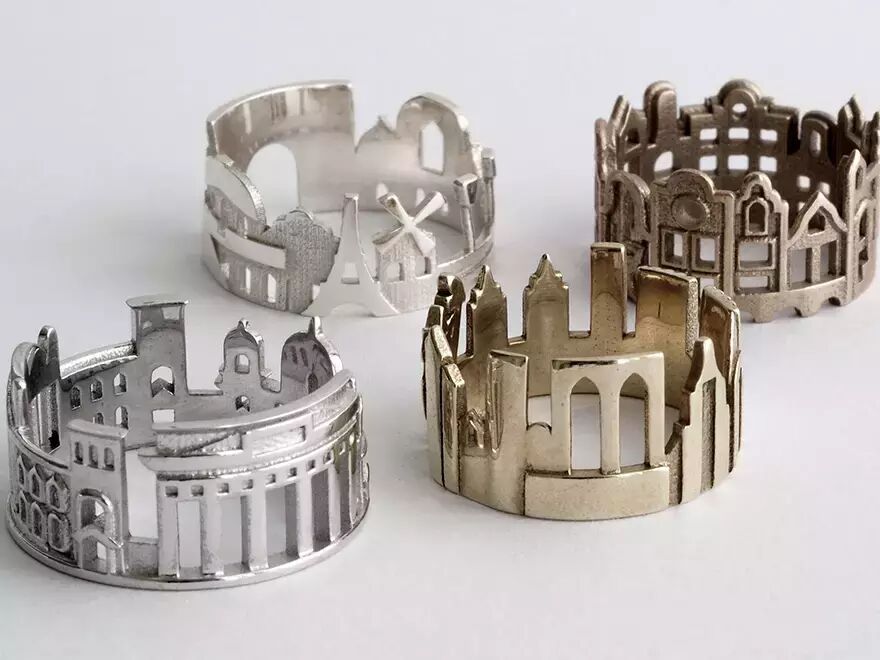 美国设计师 Ola Shekhtman 每隔一段时间就会去一趟旅行,回家后运用 3D 打印技术,将大家所熟悉的纽约、巴黎、香港、阿姆斯特丹、柏林等城市的标志性景观,变成指尖美丽的戒指。