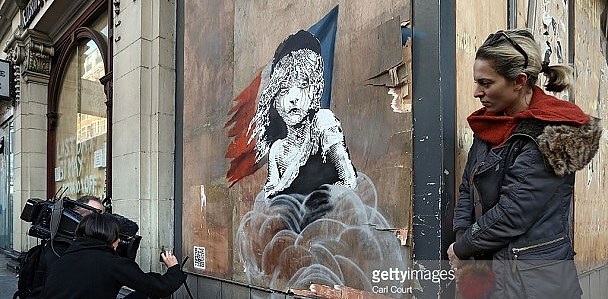1月23日夜间,英国匿名涂鸦艺术家班克斯(Banksy)在伦敦创作了一幅新的街头涂鸦作品,谴责法国政府在加莱难民营使用催泪弹驱逐难民。