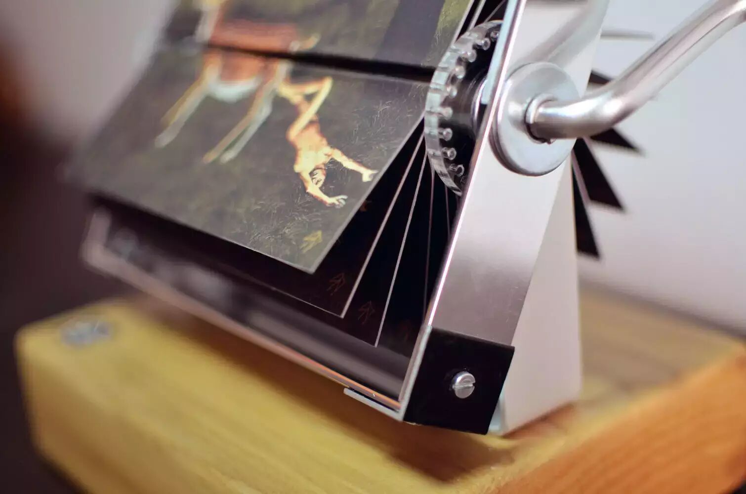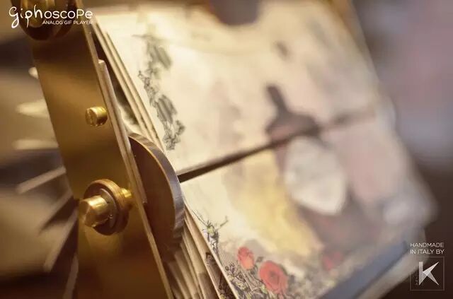 设计师先将 GIF 分隔成一幅一幅的图片,并按照顺序将它安放进去「放映机」的中轴,随后转动隔壁的摇杆,有趣的画面就出现了。