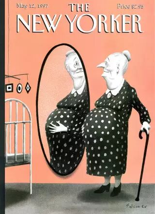 1997年,当时的新闻报道医学取得了巨大突破,让一个六十三岁的妇女成功怀孕。插画师Ian Falconer画了一个骄傲的老妇人拄着拐杖,对镜欣赏她怀孕的肚子。