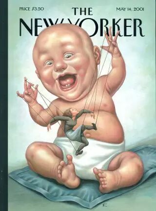 这是插画家Anita Kunz戏弄母亲节的献礼。画面中,插画家将母亲画成了提线木偶,而一个巨大的穿尿布的婴儿咯咯笑着,用短胖的手指将妈妈晃来晃去,发人深思。