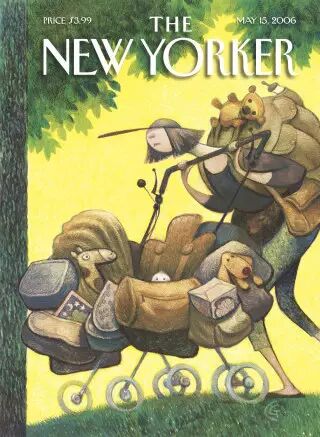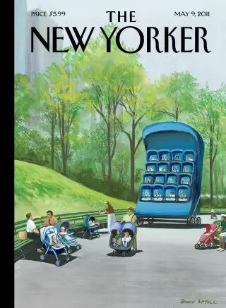 这幅插画的作者Bruce McCall说:“我不相信母亲节,甚至讨厌它。”这次封面的灵感来源于他看到很多母亲和保姆都会带孩子去公园,婴儿车大量占用了人行道。“我本可以让这个画面吓得人们害怕得尖叫,但我却将它表现成像是再自然不过的事情。”