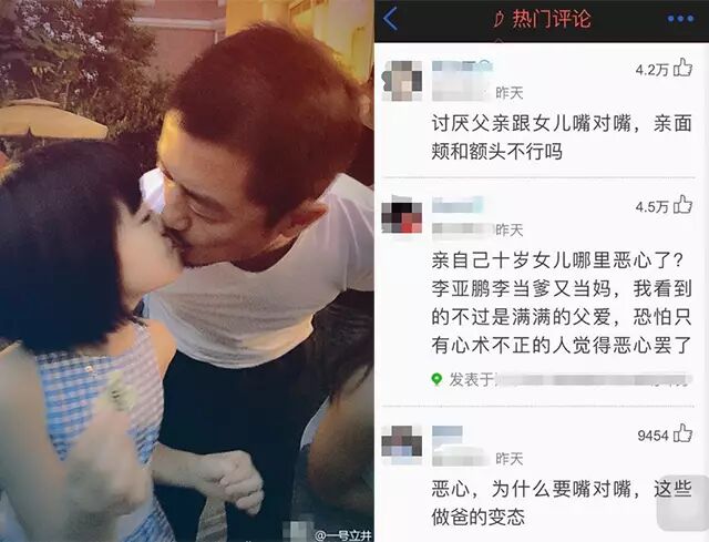 昨天,李亚鹏亲10岁女儿嘴的照片上了微信新闻的头条,毫不意外的引起了很大的争议,有人觉得这是真情流露,没什么,有人觉得父女不该这样亲嘴,很恶心。这让我想起两年前网络上流传着一个视频——珠海一个父亲在公车上哄自己的女儿,他的亲昵举止被旁边的乘客拍下来上传到网上,很多人都觉得那个父亲是变态,是在猥亵自己的女儿,还有人呼吁公安出面调查,甚至怀疑这个父亲到底是不是孩子的亲生父亲,对他在家里还能对孩子干出什么更恶劣的事浮想联翩。