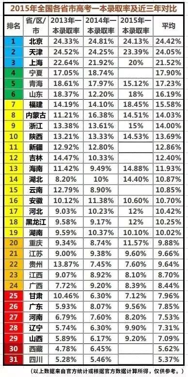 我能够理解学校将家长们召集起来专门说这件事的用心。大约一个多月前,关于近年高考分省一本录取率的数据在网络上得到热传,其中四川省的高考一本录取率在全国30多个省市自治区中为最低。近三年的一本录取率仅为5.37%,仅仅相当于最高的北京市一本录取率(24.42%)的约五分之一。以2014年为例,当年四川考生57.12万人,一本录取3.12万人,二本录取9.09万人,二本及以上录取率22.14%,仍然低于北京当年的一本录取率24.81%,也低于天津的一本录取率24.25%。这么低的录取率在四川家长中引起哗然。