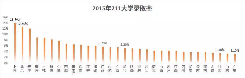 从上图中不难看出,中国经济最为发达的两个地区,上海每100名考生有14人可以考上211高校,位居榜首;而广东每100名考生只有3人可以被211高校录取,仅列末位。
