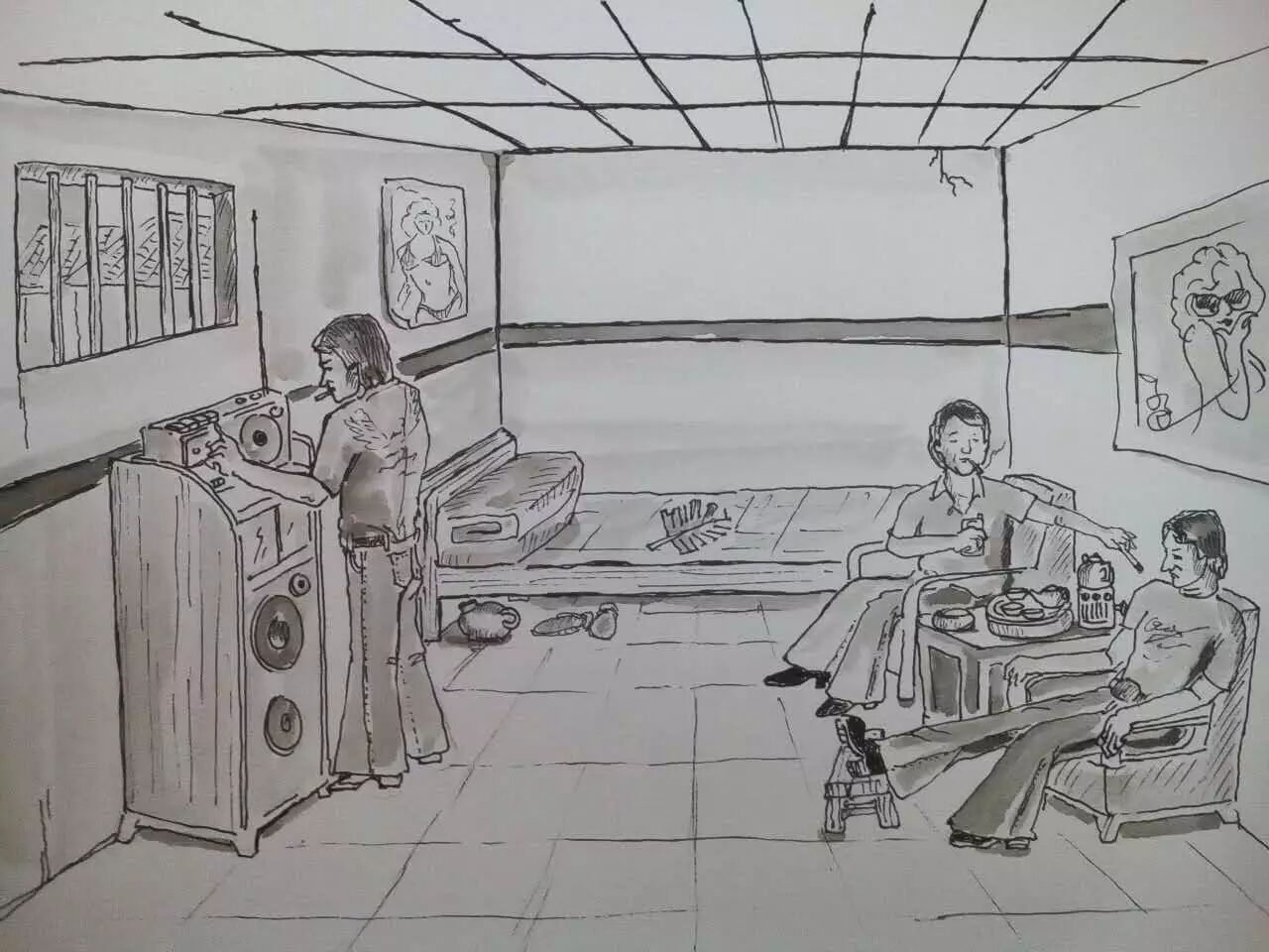 在家里听“小三洋”开沙龙的彬哥和宝生兄,林宝生绘