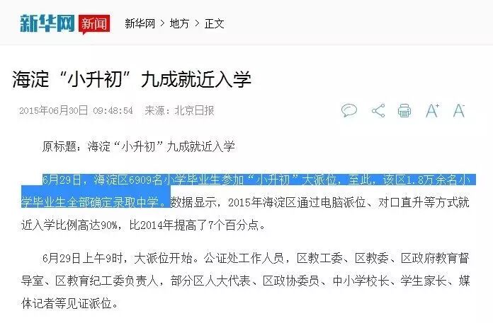 张程还没来得及反驳,妻子就列出海淀教委公布的数据: 2015年6月,在海淀区完成“小升初”的小学毕业生共1.8万人,参加“二次派位”的学生,有6909名。