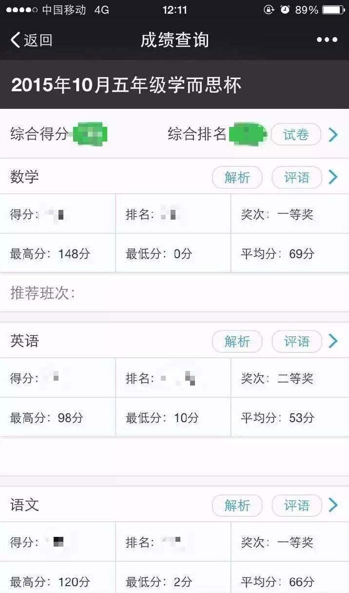 一名五年级小学生的学而思成绩单。在这次杯赛中,数学既有最高分148分,也有最低分0分。