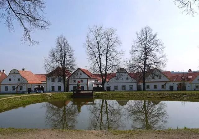 小村不大,以一个被草地围绕的小池塘为中心,四面环绕着大多为白色墙身的巴洛克风格民居。这里的巴洛克式建筑与我在途中所见到的那些村落没有什么区别,都是两层,一大一小两个门,房舍在门的左右,坡顶红瓦。它的特别之处在于齐聚效应,与其他村庄的散落各处、不成规模不同,这里的巴洛克式民宅彼此相连,多且齐整,无愧于“南波希米亚地区最大规模巴洛克式民宅建筑群”的美誉。