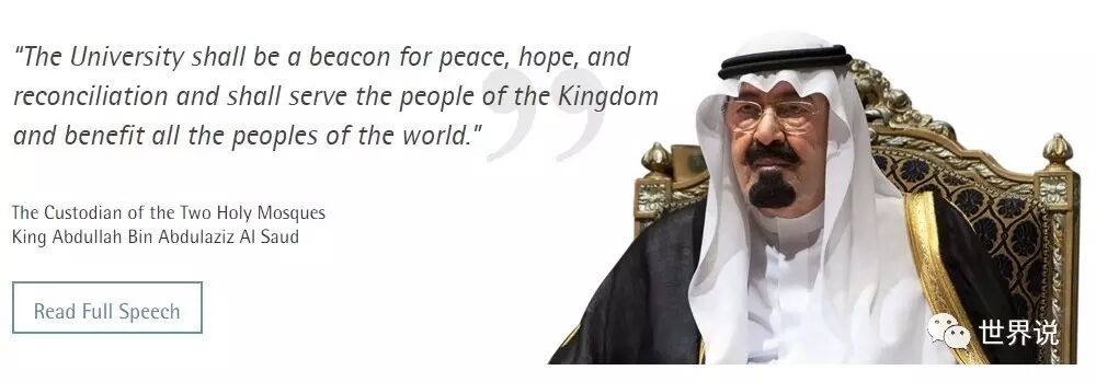 KAUST的捐赠人和创立者阿卜杜拉国王,他要在自己的国土上兴建一所集中全世界学术界精英的大学,以探究宇宙秘密。这所大学要解决不只是沙特阿拉伯或中东地区面临的问题,甚至是全人类所面对的最迫切问题。他要使这所大学成为新生代知识的明灯。所以KAUST一直都将自己定位为研究所:只招收研究生、博士生;只开设理工科,摒弃传统的学院等部门制度,建立一个个高精尖的跨学科中心。KAUST是一个西方式大学,不由沙特教育部管辖,而是由国际知名的学者、教授组成的独立董事来管理。KAUST不会把自己向综合型大学上发展,也不会增设本科教育。KAUST是一个立志为沙特现在和未来发展提供原动力的研究所。