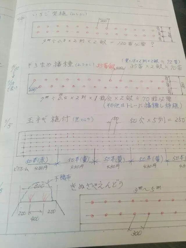 这是每颗菜苗之间的播种距离,行列相乘,一共需要购买多少菜苗,需要多少钱。演算过程清清楚楚。不同区间,同一作物的颜色也不尽相同。