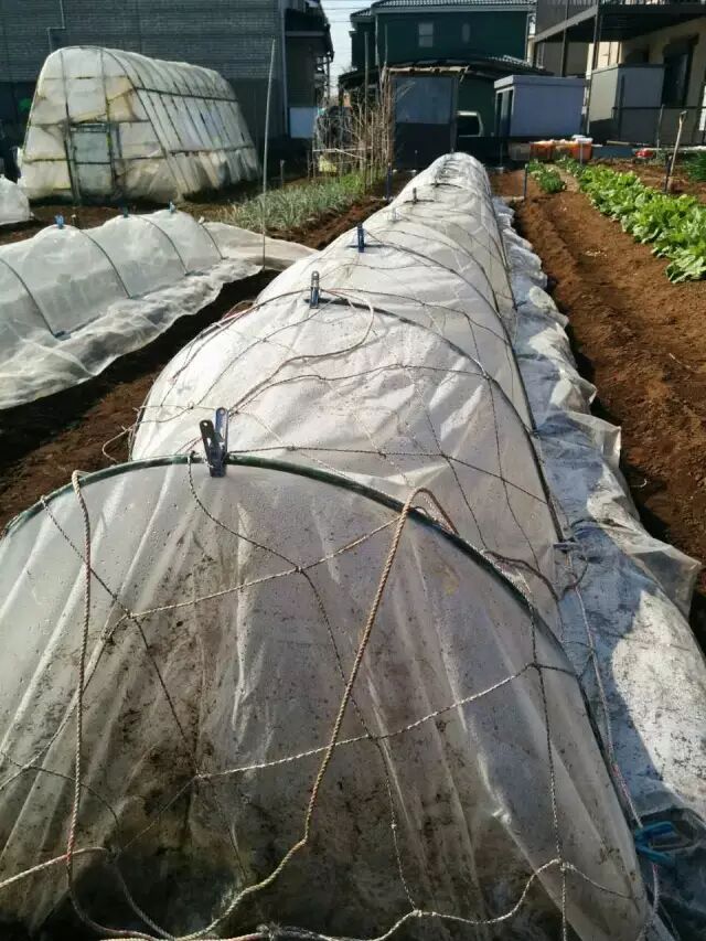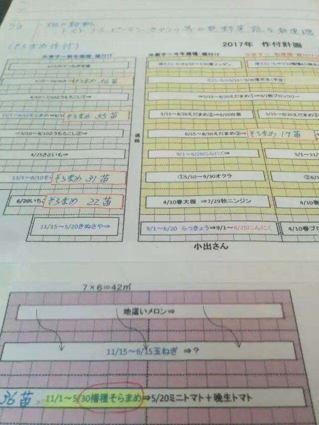 纵向第一列是作物名称——一年到头,他一共要种草莓、西瓜、洋葱、胡萝卜、毛豆、西红柿、柿子椒等十几种。而横轴则表示时间推移,红色条框代表播种,黄色代表移植菜苗,而淡绿色则代表收割——条框的长短则表示各项作业所需要的时间。岳父曾经神采飞扬地对我说,同一块土地,一两年间最好不种同一种作物,不然有可能出现产量降低,出现病虫害等情况而难以继续种植下去——此所谓连作障害。