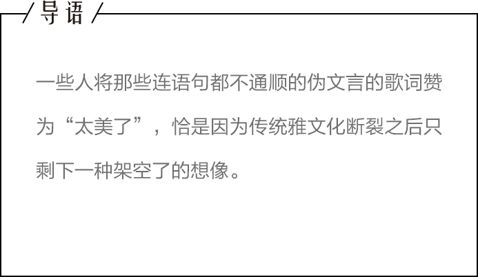 一些人将那些连语句都不通顺的伪文言的歌词赞为“太美了”,恰是因为传统雅文化断裂之后只剩下一种架空了的想像,那些堆砌的词藻也就是只是一堆破碎的元素,就像一个老外拿着中国的古玩来点缀自己的居室,说这是“中国风”,但却总让人感觉哪里有点不对劲。