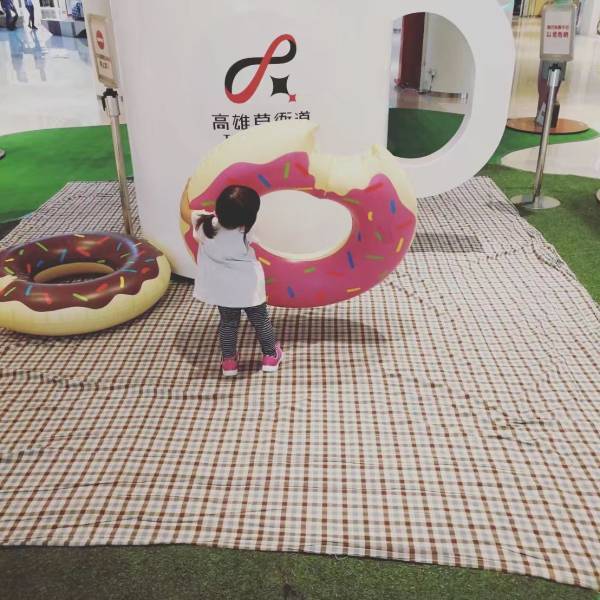 刚好百货公司有活动,门口摆着大茶杯跟大大小小的(充气)甜甜圈让小朋友随便玩,她也冲进去跟小朋友玩得很开心。