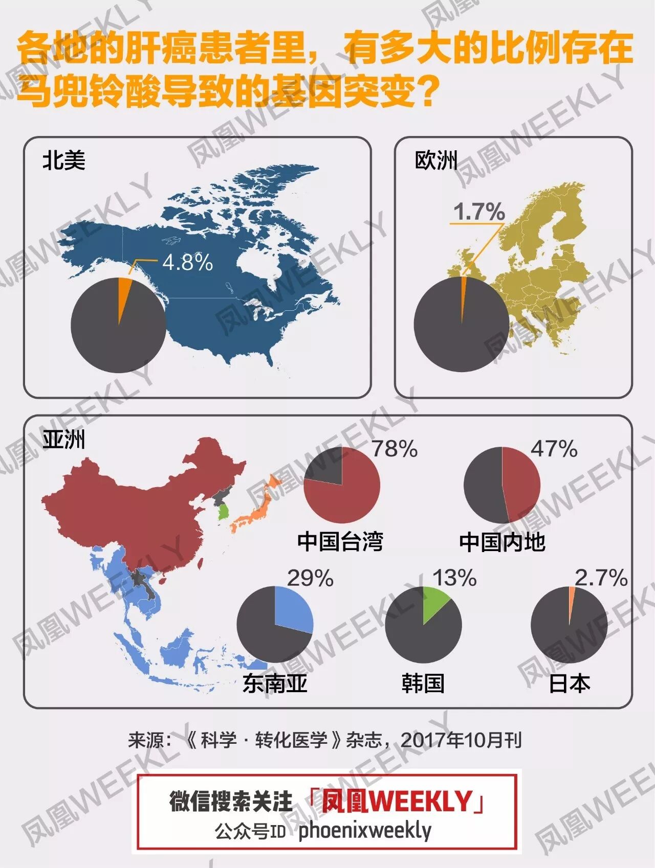 结果发现,台湾两家医院的98例肝癌病人当中,78%具有马兜铃酸诱发的基因突变特征,内地89例肝癌病人当中,47%具有马兜铃酸诱发的特征;而在北美和欧洲,这一数字分别只有1.7%和4.8%;至于东南亚和日韩的数据,介于前述两者之间。