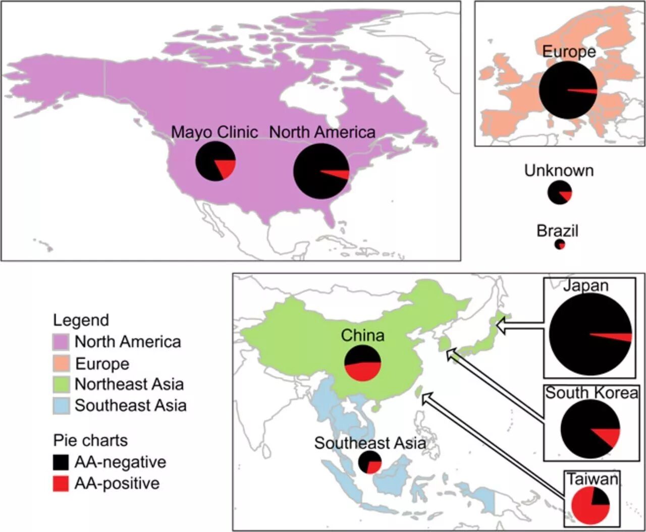 总之,这是目前证明马兜铃酸诱导肝癌的最有力的证据。这一结果表明,亚洲地区人群的肝癌和马兜铃酸产生的突变高度相关,其中又以台湾及中国内地最高。