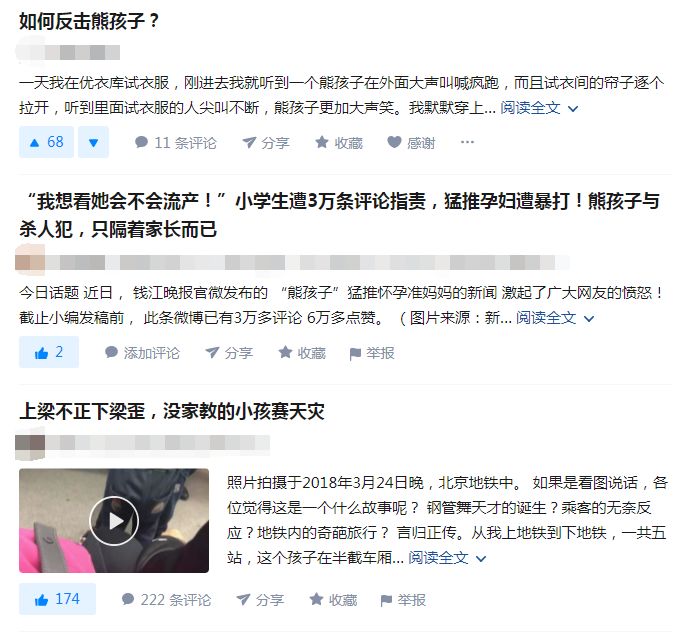 这些文章的描述中,熊孩子想让孕妇流产,想把路人推进地铁轨道,把火锅倒在姑娘的脸上…总之是杀人放火,无恶不作。