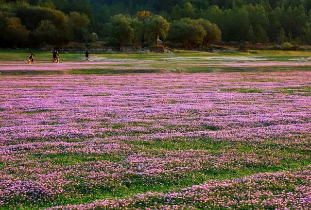 其实,最大的惊奇还在后面。从斜里漫步半小时左右,到达奇墅湖。秋季里,湖边逐渐长出大片的粉色小花,把湖边河滩染成一片惹眼的粉红,犹如一场视觉的盛宴。