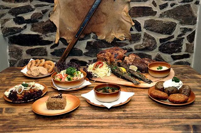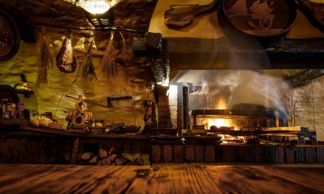 整个餐厅都是粗犷狂野的风格,半圆的空间,原石状的墙壁,挂着各种打猎工具。