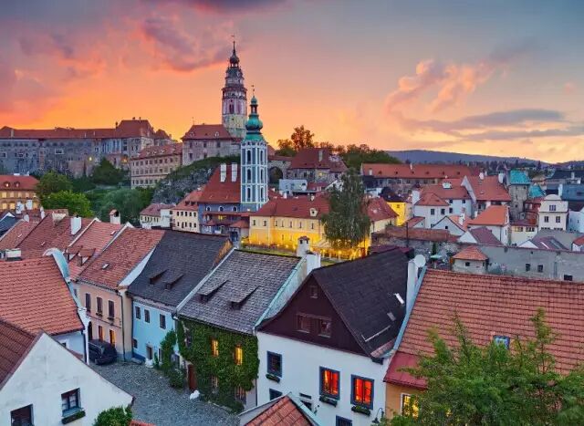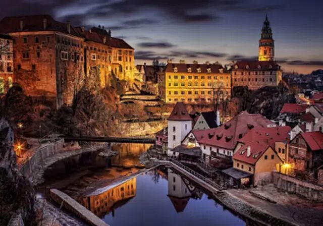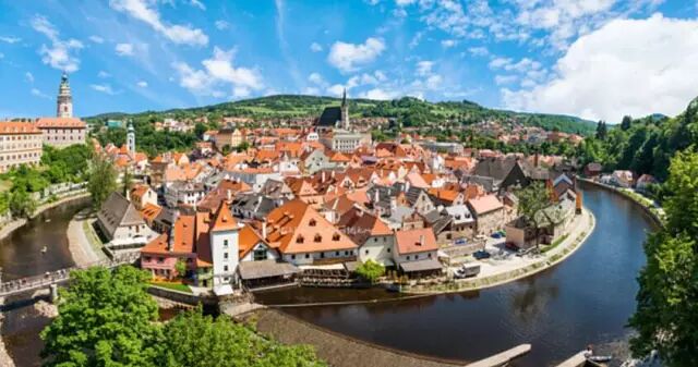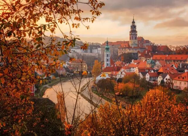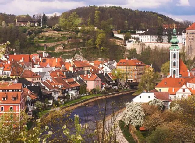 兴建于1240年的中世纪城堡与色彩绚丽的彩绘塔隔着伏尔塔瓦河与小镇相对。