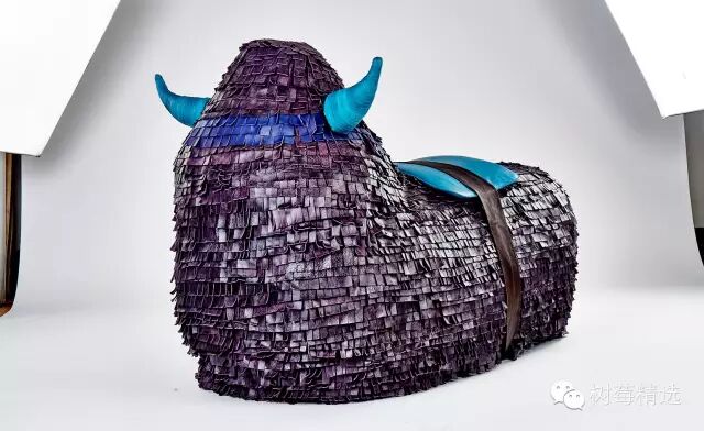 根据统计, 全球每年会产生超多800,000吨的废旧皮革, 因此,皮革专家Alma想出一个对应的解决方案把这些被浪费掉的皮革都再生利用起来, 他携手了6位伦敦中央圣马丁设计学院的( Central Saint Martins)的毕业生设计并制造了这个超级牛气的“牛座驾”,展出后瞬间就成为了这次设计节最重的装置艺术品。