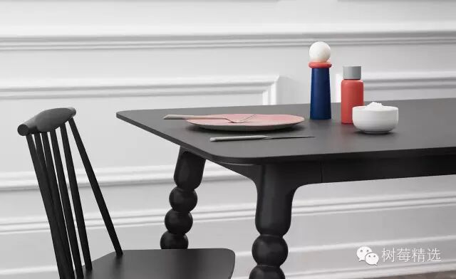 桌子上的盐和胡椒两件套是用山毛榉木材制成的, 瑞士著名设计师YvesBehar用这款新作品诠释家具功能与设计美学的完美融合。