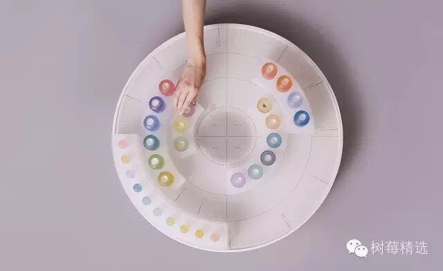 韩国设计师Kyugum Hwang设计的“气味调色盘,他想通知这个展示告诉观众“颜色的对于制造个人香气重要性”。
