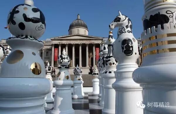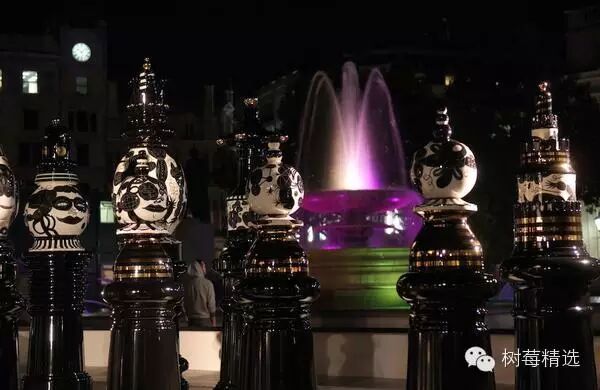 有个意大利陶瓷艺术家叫Jaime Hayón, 他在伦敦的Trafalgar Square(伦敦的地标性广场)展出了一个巨大的国际象棋陶瓷矩阵, 每一件陶瓷都是他亲手制造的, 象棋陶瓷上的每一个花纹代表了伦敦的一部分: