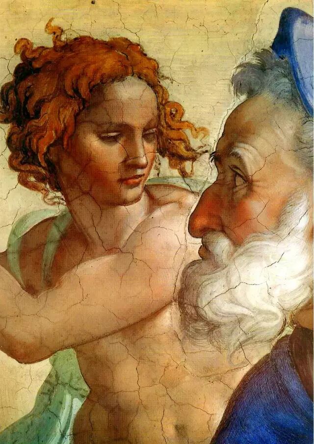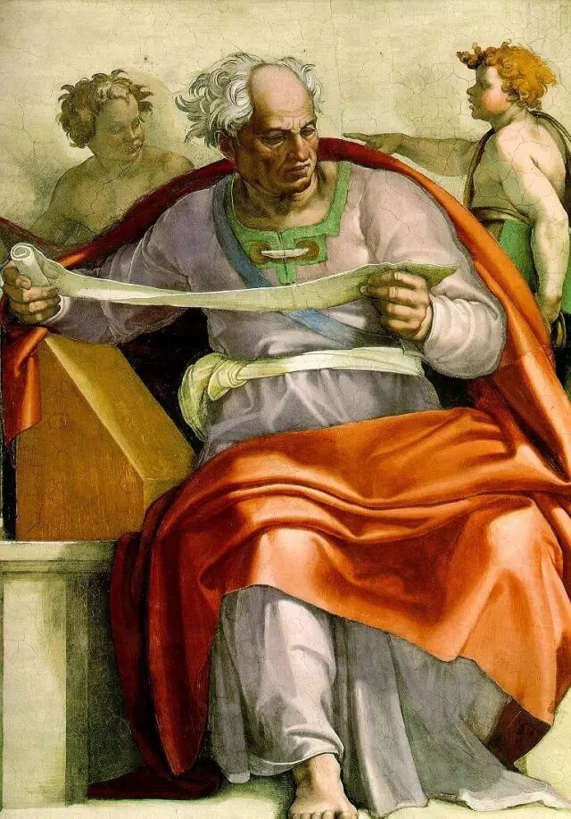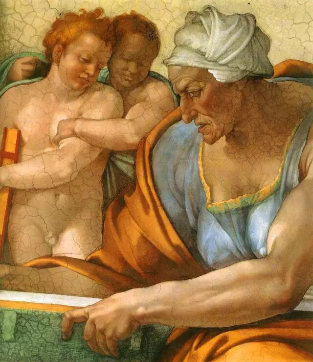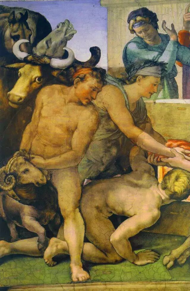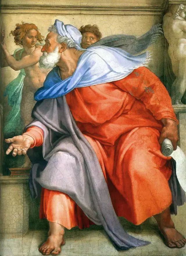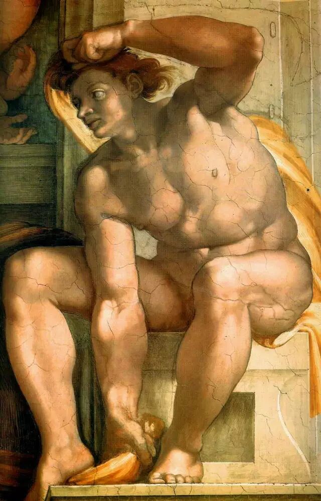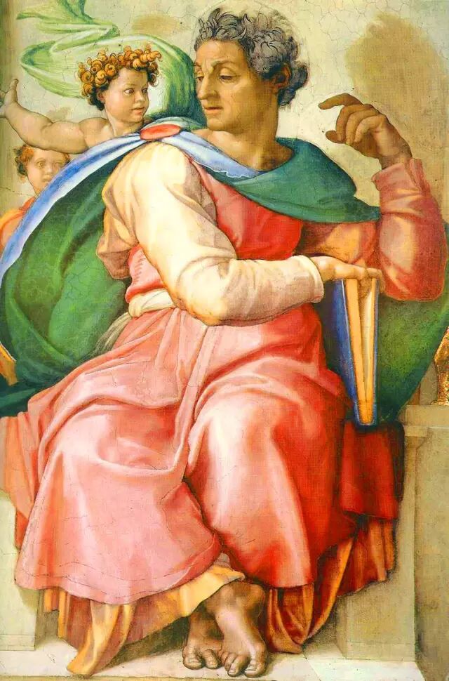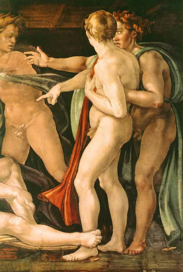 有的重在表现英雄人物的复杂内心世界,有的为加强先知与女巫的聪慧与睿智因素所有那些作为四角装饰的裸体形象,则是他的裸体雕像主题的绘画再现,他们有的是一些民族利益的捍卫者,有的在赞美自身的美,有的是在检阅巨大的天赋人权。当拉斐尔看了这幅巨大的天顶画之后,不禁感慨地说:“米开朗基罗是用上帝一样杰出的天赋创造这个艺术世界的!”