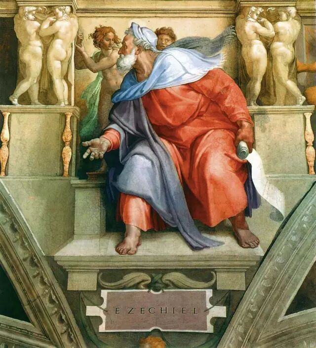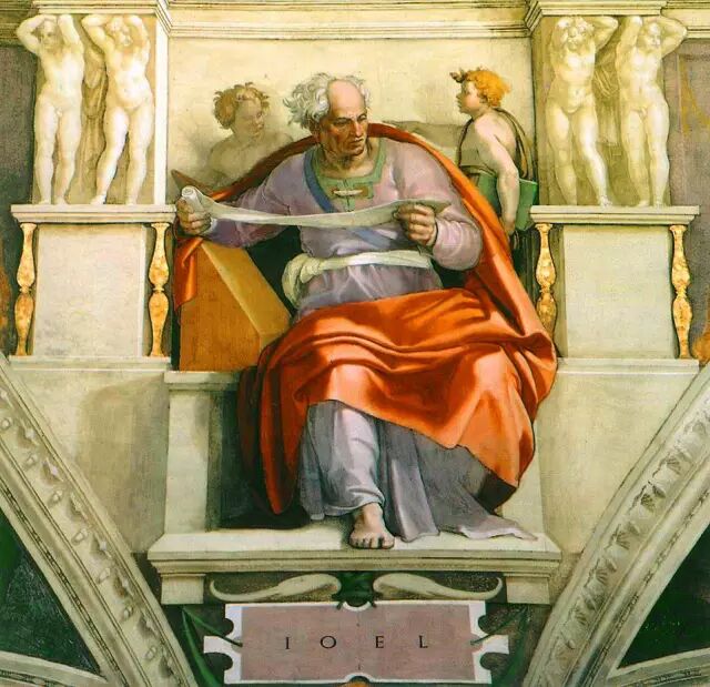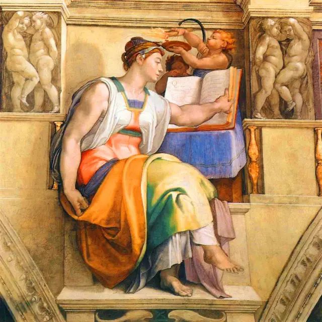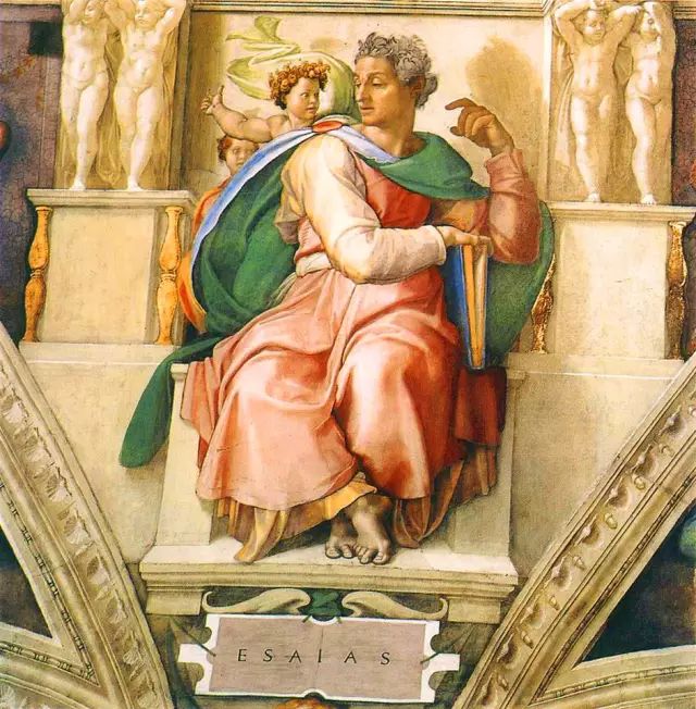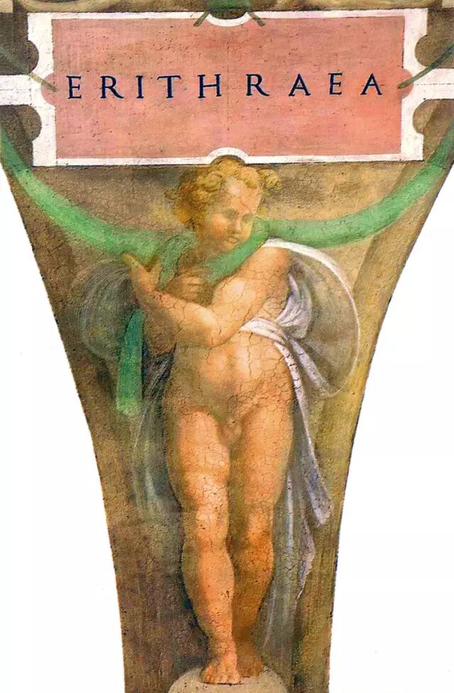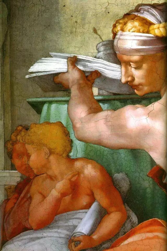 周围再以建筑结构等柱壁装饰,把每个画面分隔开。并在每一分隔的区域内四角,画上共二十个裸体青年,再在各区域的四个大框内画了十二个形体较大的先知与巫女的形象。