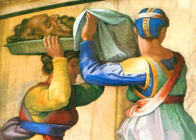 矩形的两条长边上,共有八个三角档,在档与档之间又画了“基督祖先的故事”,而在矩形两端的四个大三角档内,又画了四个圣经故事:《礼拜铜蛇》(The Brazen Serpent)、《大卫杀哥利亚》(David and Goliath)、《哈曼的磔刑》(Punishment of Haman)、《朱提斯杀荷罗芬尼斯》(Judith and Holofernes),共同组成一首以颂扬人类创造性智慧,赞美人性与人的肉体的美的宏伟的色彩交响曲。