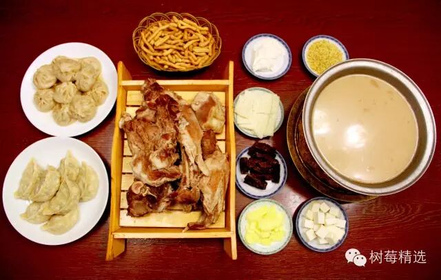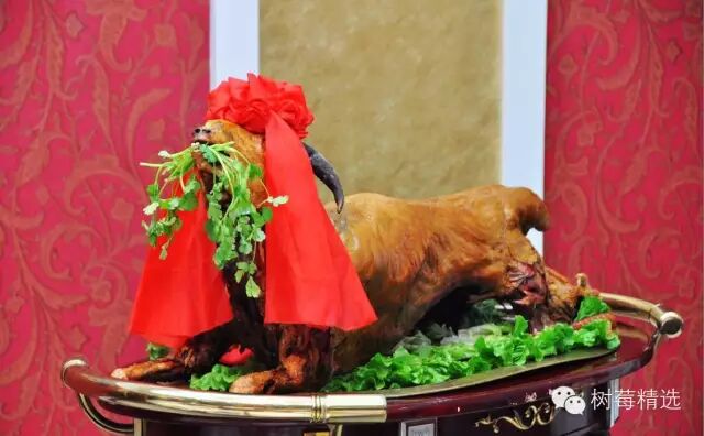 烤全羊是蒙古族招待贵宾的传统佳肴,上席用一大木盘,使羊平卧盘中,羊脖上系一红绸带以示吉利和隆重。