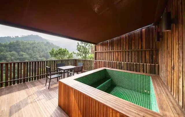 除了树屋的诱惑和无敌美景,每栋别墅还独享私人泡池(一室为温泉浴缸)。度假村深挖两千多米的地热水,清澈温和,出水温度高达48摄氏度, 富含硅、钾、钙、钠、氟、氯、溴等20多种有利于人体健康的有益矿物质和多种微量元素, 闻上去有淡淡的铁锈味, 有护肤美容、保健祛疾之功效。