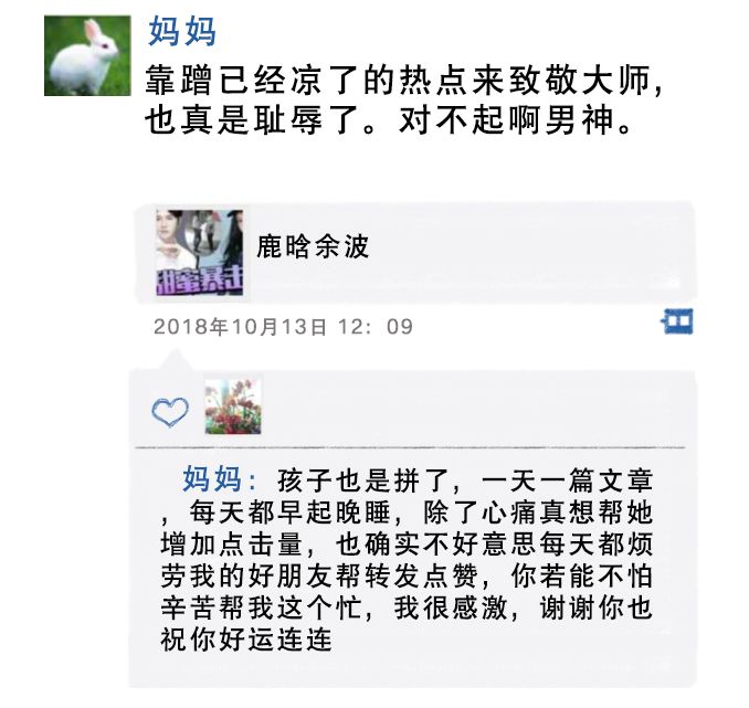 我以为我妈永远不会不好意思,却忘了我的薄脸皮完全是传承自她。去年10月的某一天,她的分享语是这样的:“孩子也是拼了,一天一篇文章,每天都早起晚睡,除了心痛真想帮她增加些点击量,也确实不好意思每天都烦劳我的好朋友帮忙转发点赞,你若能不怕辛苦帮我这个忙,我很感激。谢谢你,也祝你好运连连!”让我觉得难过又感激。