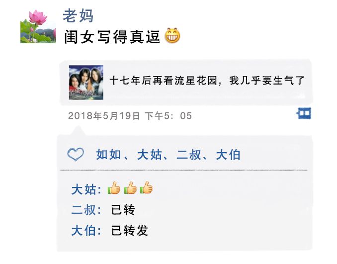 但是她会转发说:“女儿写得真逗。”也会装作无意地问我,上初中的时候总是不回家,是不是就是受了这部电视剧的教唆?但我其实蛮排斥跟她聊这些的,当着她的面去回忆青春,让我觉得尴尬。