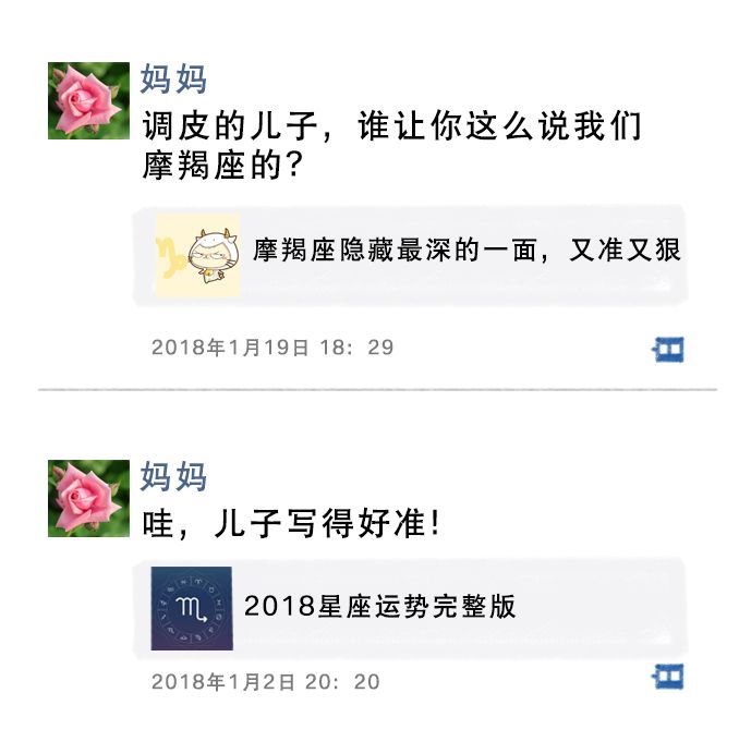 而且我妈非常善于在朋友圈吹我牛逼,每次都看得我血脉偾张,很害怕。她分享一篇文章,文案总是非常到位,角度和尺度都十分新颖。之前我做星座预测,她天天转发之余,疯狂地迷上了星座。“哇!儿子写的!好准!”“调皮的儿子,谁让你这么说我们摩羯座的?”看得我整个人羞耻感爆炸。
