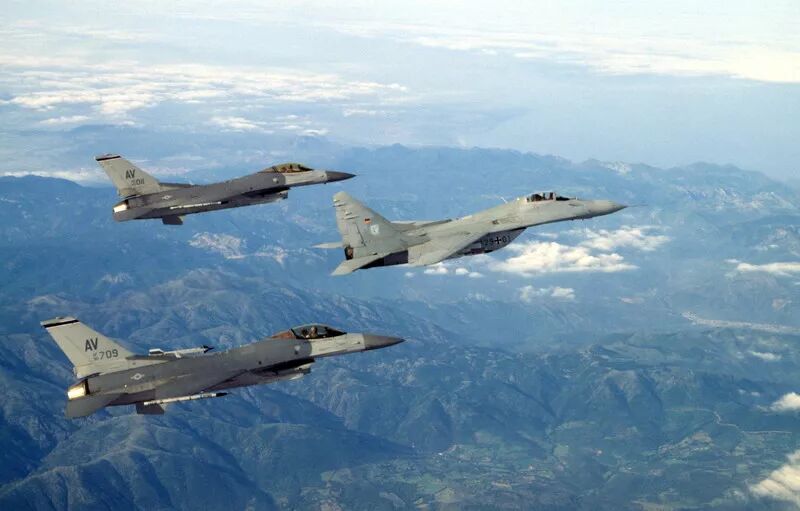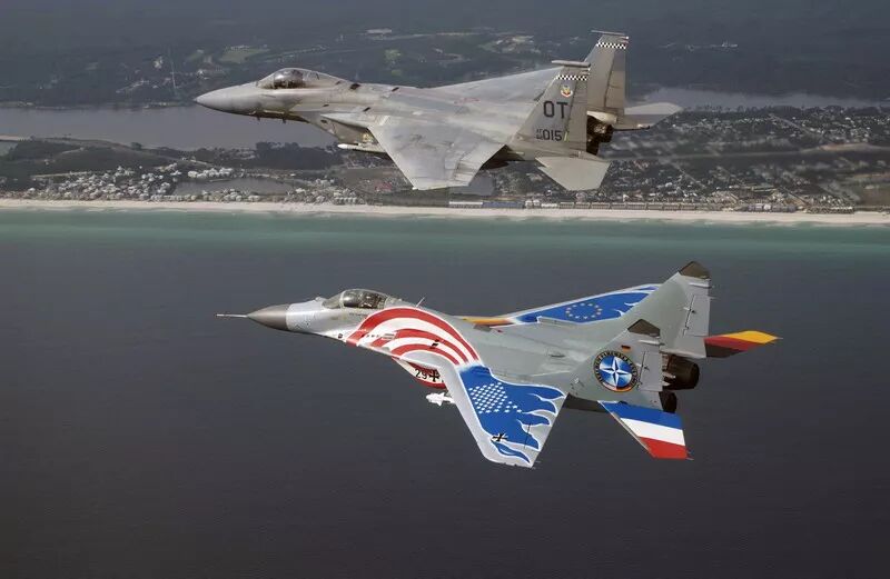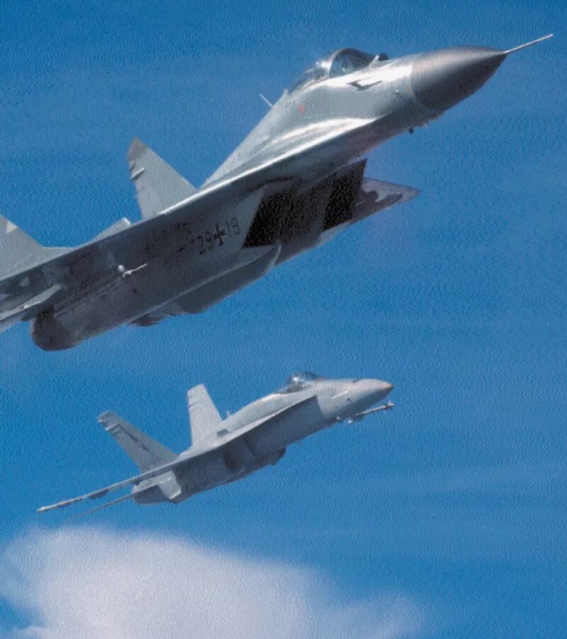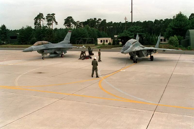 1990年12月,沃尔夫冈·米沙尔斯基少校从第36战斗轰炸机联队(JaboG 36)调任普列兴成为米格-29中队长,他之前的联队驻扎在威斯特伐利亚州莱因-霍普斯滕空军基地,飞F-4F。他是参与评估的四位飞行员之一:“当我在1990年12月第一次看到‘支点’时,我惊呆了。当时我对该机一无所知,只知道一些泛泛的情报报道。米格-29在1986年对芬兰的访问中首次公开露面,并在1989年的巴黎航展上坠机。对我来说它是‘对手’,是终极威胁,我们接受的所有训练就是为了击败它,突然之间我们却要驾驶它飞行。” “在评估中,我们在北海上空与所有型号北约战斗机进行了对抗,并为‘沙漠风暴’行动中的北约预警机的确定了‘掉头和逃跑’参数。这种训练也被叫做‘逃生派对’。” 他们的另一项任务是找出“支点”在华约防空系统内的作战方式。“我们发现由于数据链的存在,这套由GCI(地面控制拦截)紧密控制的系统即使在强电子干扰下也能正常工作。这符合苏联人的哲学,而我们接受的训练是自主决策并行动。” “在1991年3-4月间我们首次部署‘德奇’(德奇莫曼努)期间,我们对抗了美国的F-16、F-15,英国的‘狂风’F3等战斗机。很显然由于航电缺陷,‘支点’无法在超视距场景中与现代西方战斗机对抗。从雷达获得的信息非常有限,该机只有在良好GCI支持下才能发挥出战斗力。”  1995年德国米格-29与北约战斗机的编队飞行