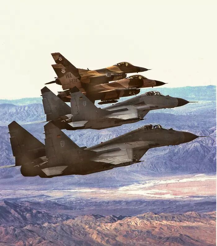 “米格-29安装了特别为此目的设计的装备。通过该系统,米格飞行员在仪表气象条件拦截中可在无线电静默情况下被引导到武器射程内,全程无需开雷达。随后开启雷达只是为了实施导弹攻击。” “但这套系统不兼容北约标准,而且也不存在完备的地面系统了,德国空军无法以这种方式操作米格-29。同时德国空军认为保留东德LAZUR地面管制系统不经济。” 德国空军从米格-29上拆除的LAZUR数据链系统受到的主要批评是不允许飞行员自主决策。 但迈克尔补充道:“如果飞行员想主动作战,他总有机会切换到手动。而且有了这套系统后,米格-29作战效率比其他自主作战的战斗机更高。” 为了符合北约标准,米格-29上的许多系统被替换或拆除,这些改动并不总是受到飞行员的欢迎,因为其中一些会导致飞机作战能力的下降。 除LAZUR数据链外,俄制RSBN无线电短程导航系统是另一个例子,许多飞行员认为该系统比取代其的TACAN系统更有效率。  在DACT训练中被米格-29用机炮干掉的F-16