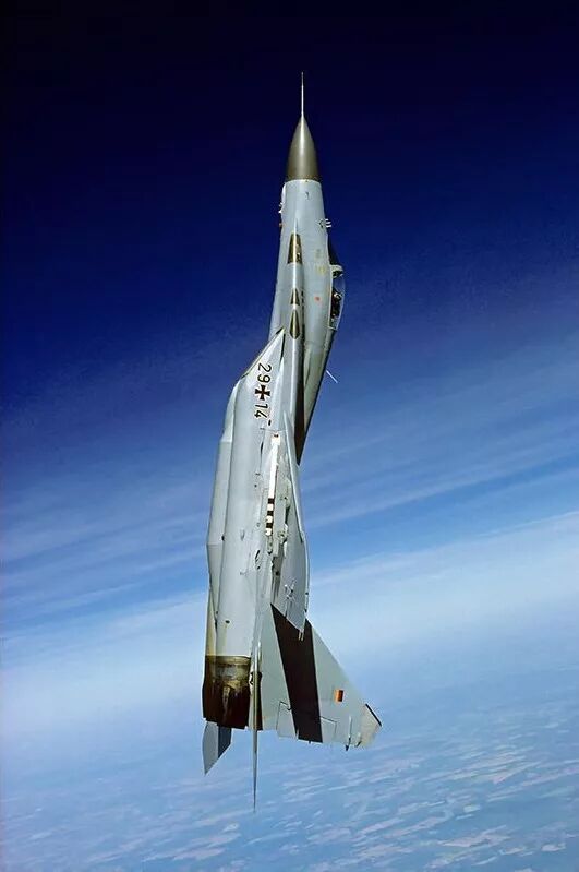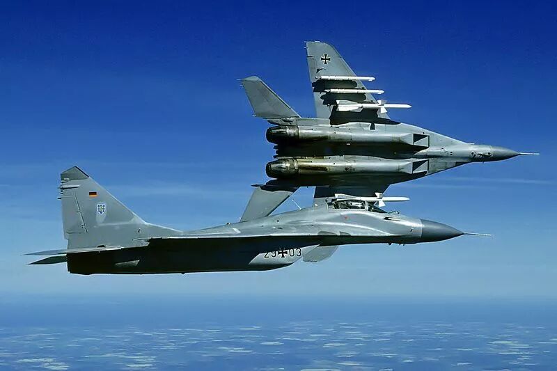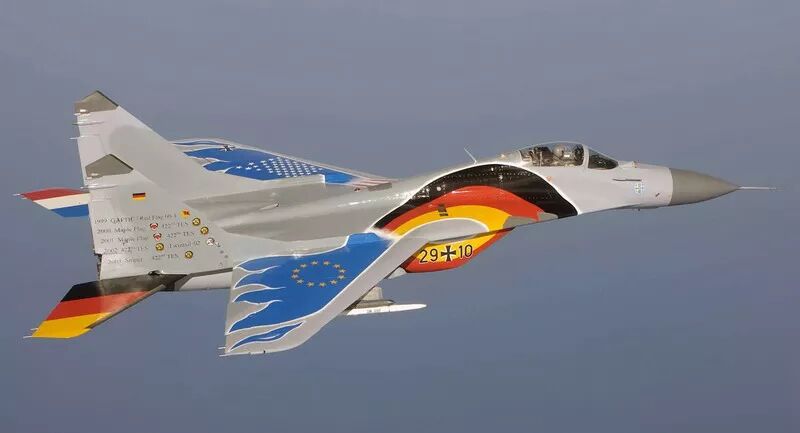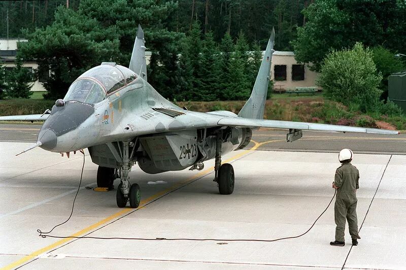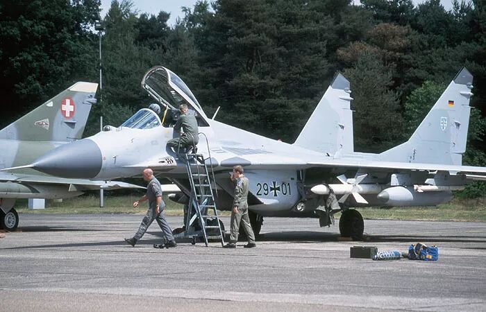 “一旦进入视距内或者交汇,空战就完全不同了。根据飞行员的技能,再结合该机的机动能力和‘射手’导弹与头盔瞄准具后,空战多少会变成一场势均力敌的游戏。当然,与F-16、F-15和F/A-18相比,米格-29的滞空时间总是一个限制。” “谈到最大性能和最佳机动性,你要知道我们四个人都仅仅在米格-29上飞了50个小时,而且米格-29仍然处于原装状态。也就是说座舱和机身上都是西里尔文,并采用公制飞行仪表。” 沃尔夫冈担任米格-29中队指挥官直到1995年。 评估结束后,德国空军决定接受米格-29,并于1991年10月将该机型纳入北约防空系统,命名为米格-29G,G代表德国。  挂载R-27、R-73训练弹和行李吊舱的德国米格-29