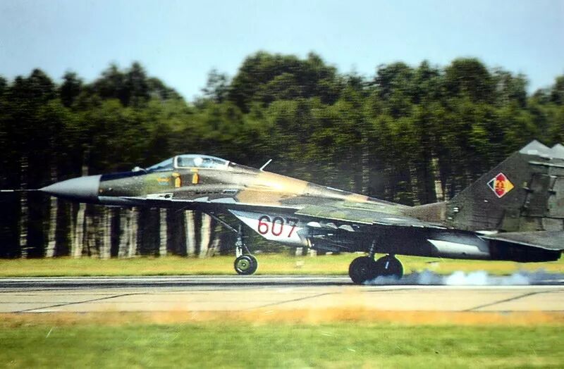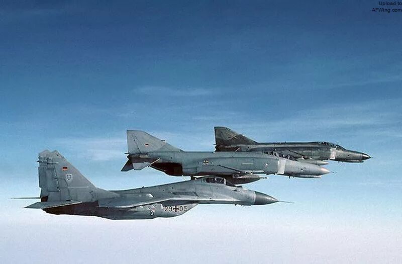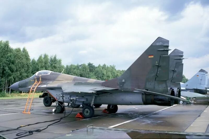 加入德国空军 1990年10月3日,德意志联邦共和国和德意志民主共和国同意成为一个国家。一天后,普列兴空军基地的JG-3和米格-29都处于德国联邦国防军的控制之下。 1990年10月19日,德国空军飞行员驾驶米格-29 604号在普列兴进行了首次飞行,该机仍然保留着东德空军的迷彩涂装,但标上了29+01的新序列号。  两德统一后改换门庭的米格-29 607号