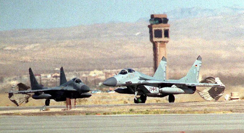 1991年1月,4架米格-29前往曼兴的国防军第61飞机和航空装备部(WTD61)接受评估,以确定这种战斗机是否适合加入德国空军。同时,四位经验丰富的飞行员(都具有武器教官和试飞员资格)被派往普列兴,从作战观点评估米格-29。 作为这次评估行动的一部分,四架米格-29于1991年3月被前往维特蒙德港空军基地,与JG 71的F-4F一起飞行。四月又有四架“支点”被部署到撒丁岛的德奇莫曼努空军基地。这座岛的西边有一座装备有空战机动装置(ACMI)的训练场机,可供北约战斗机磨炼自己的异机型格斗(DACT)技能。  德国空军的米格-29UB教练机