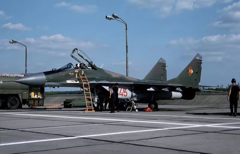 “支点”在民主德国 1988年3月12日,苏联飞行员驾驶四架米格-29降落在德意志民主共和国的普列兴空军基地。这是24架米格-29战斗机(20架单座型和4架双座型米格-29UB)中的首批飞机,将装备东德空军第3战斗机联队(JG-3)。  东德空军JG-3联队的米格-29