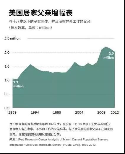 如果跟美国对比一下就会发现,在美国,居家专事照顾子女的父亲,1989-2012年的二十多年间,从100万翻倍增长到了200万。