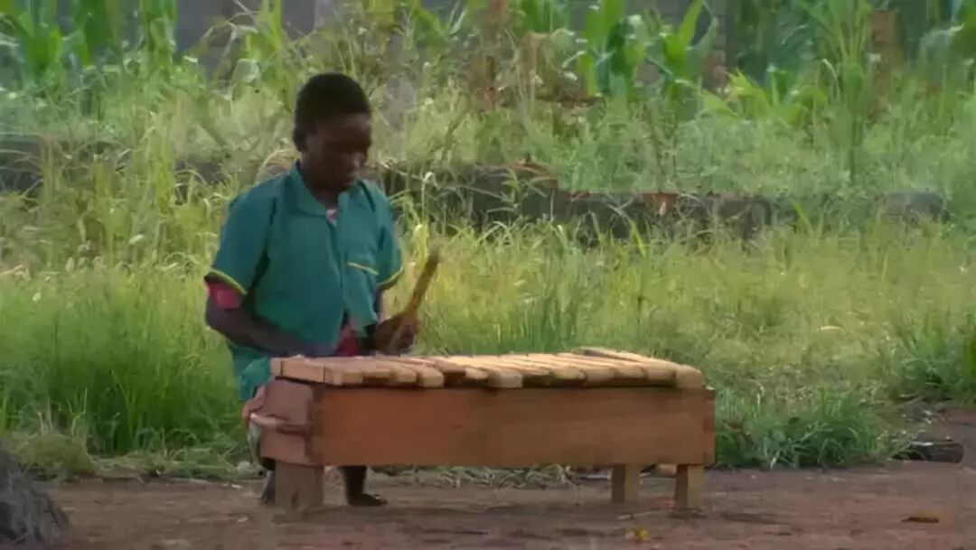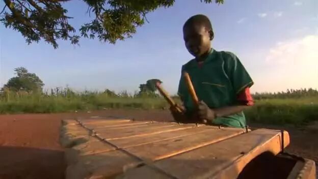 他的木琴很破,由几块木头和钉子组合而成,木头两头都磨损了,一碰就散架…