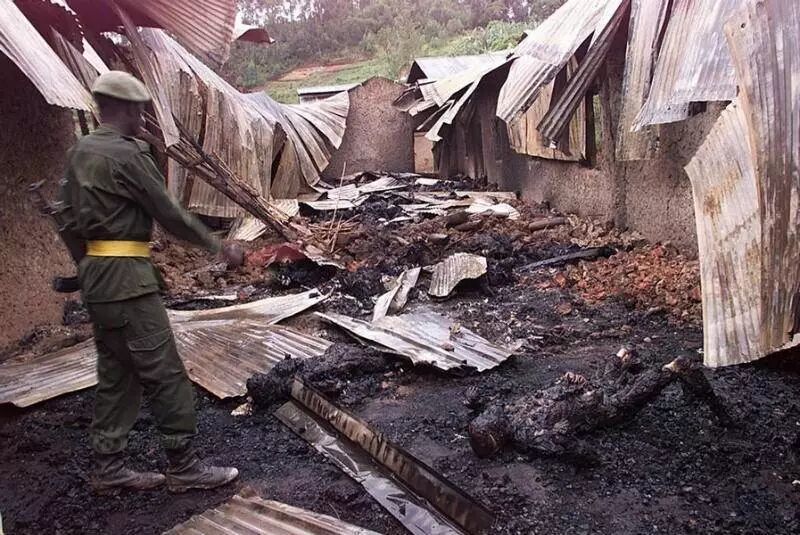 2000年3月17日,在乌干达卡农古镇的教堂中,组织首领基布维特尔声称圣母玛利亚显灵,组织530多信徒彻夜狂欢,泼洒汽油,包括78名儿童在内的信徒被活活烧死。事后,警方在多处发掘出778具尸体。 | 图片来自:视觉中国