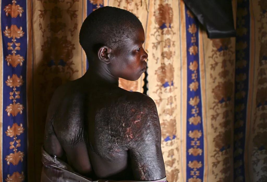38岁的Hellen Akello展示在圣主抵抗军给他造成的伤口图片来自:视觉中国
