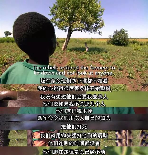 14岁的多明尼克说:有一天,叛军命令我杀死一群农民,我拿着锄头,朝他们的后脑勺狠敲…我看见这些人的脚还在动,头已经不动了…